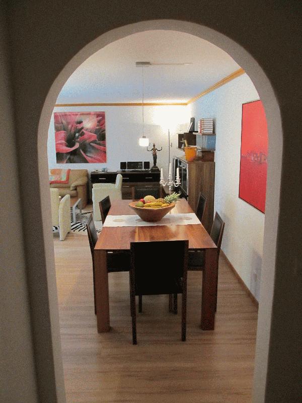 4 1/2 Zimmerwohnung (105m2), im Erdgeschoss in Mehrfamilienhaus mit Garagenplatz Nr. 24, Skiraum, Balkon. Sep. Küche mit Backofen, Kühlschrank, Geschirrspülmaschine, Kaffeemaschine; 1 Bad/WC, 1 Dusche/WC; 3 Schlafzimmer, 2 mit je 1 Doppelbett (2 Matratzen), ein Zimmer mit einem breiten (140cm) Bett; Wohn-Esszimmer mit Polstergruppe, Essecke; Bettwäsche, Küchentücher, Frotteewäsche, Duvet nordisch; Telefon, TV, Radio; Abfallsack (blau), WC-Papier. Haustiere sind nicht erlaubt!